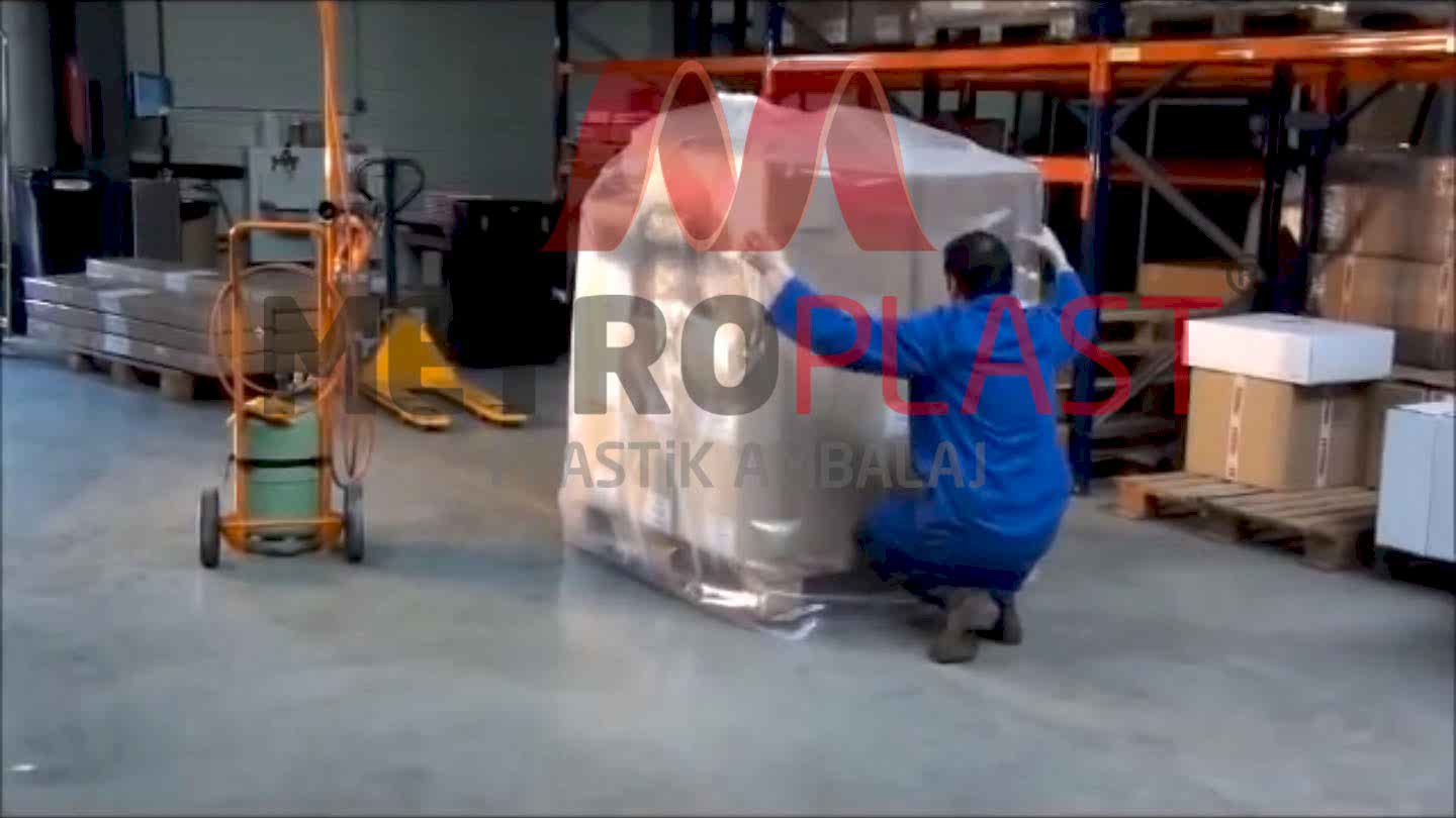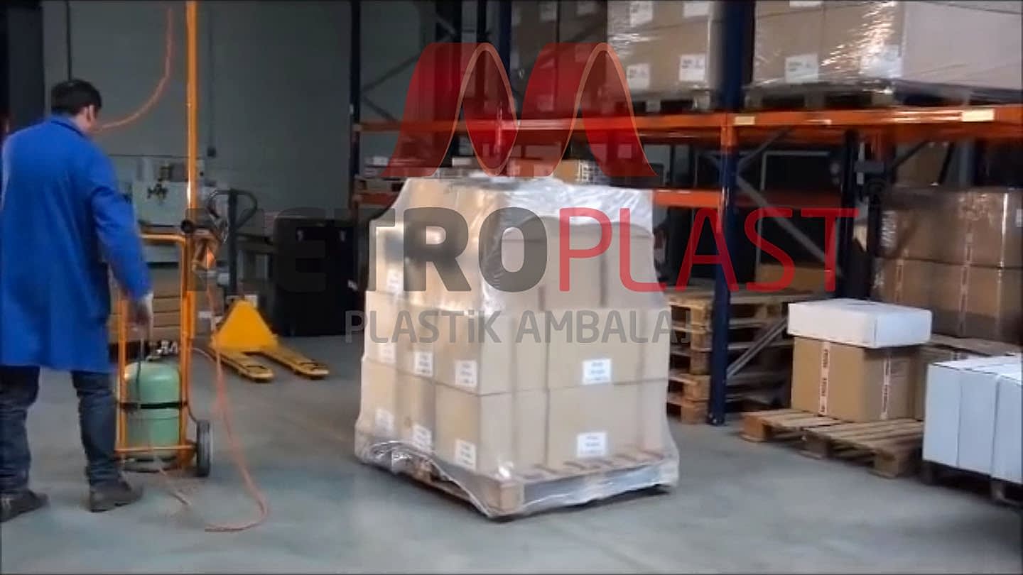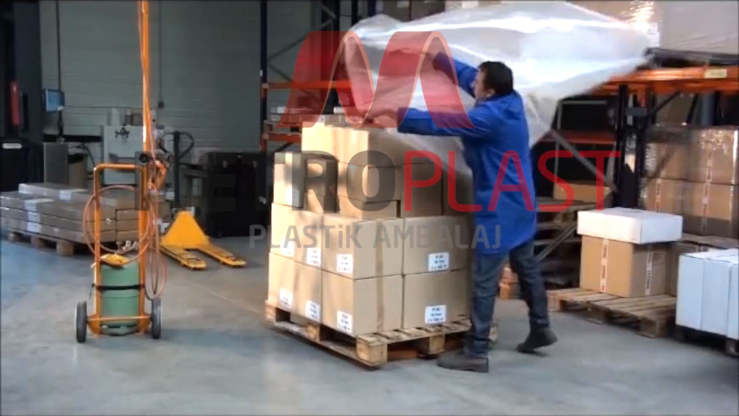 Ambalajlanacak malzemenin ebadına, ağırlığına göre belirlenmiş palet örtüsü (kalınlık-ebat), ambalajlanacak malzemenin şapka gibi üstüne geçirilerek ısıl işleme tabi tutulur.Bu işlem sırasında palet örtüsü, enine ve boyuna çekme tepkisi verir. Bu tepki sayesinde malzemeye tam olarak sarılır.