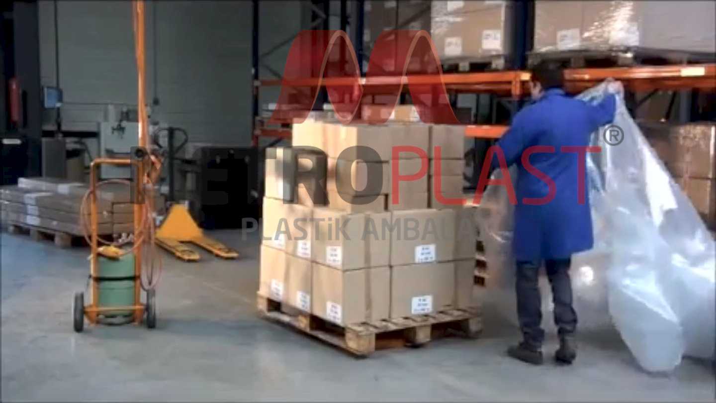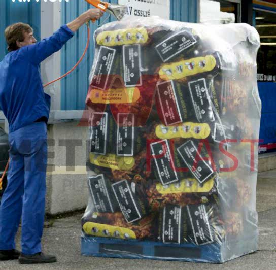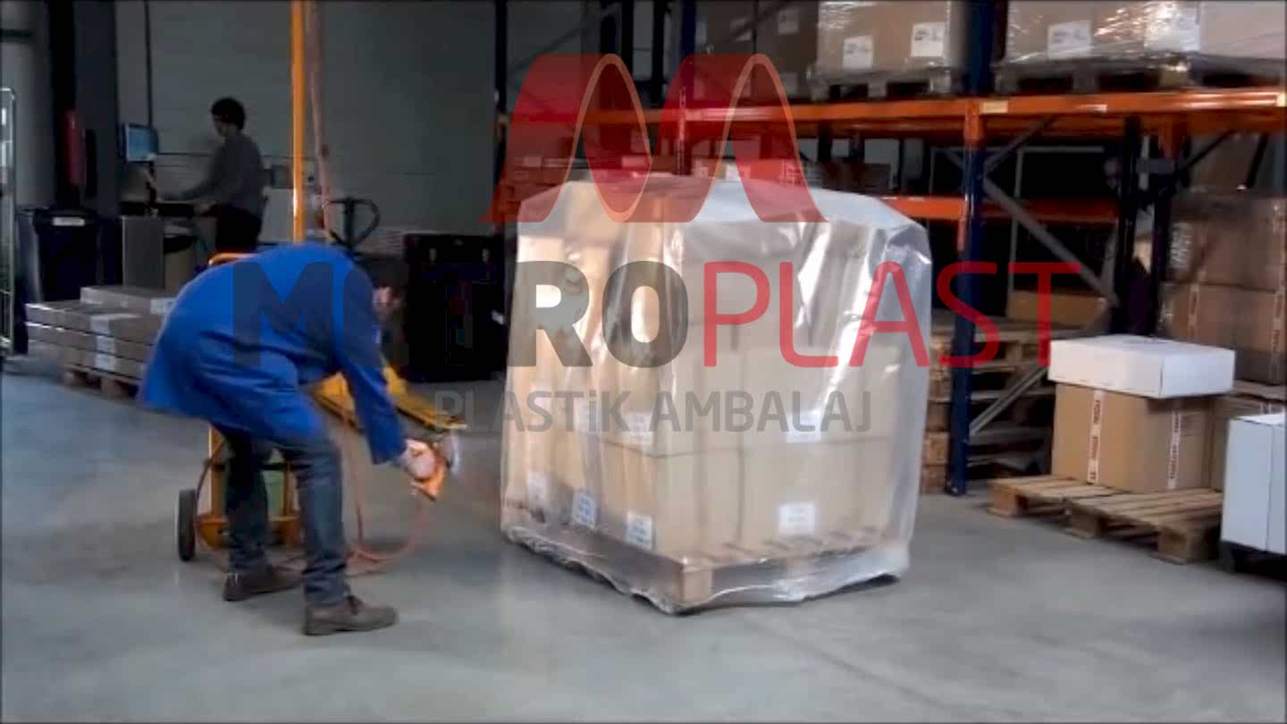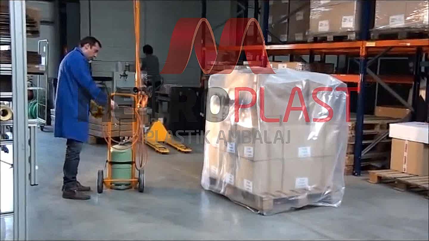 Ambalajlanacak malzemenin ebadına, ağırlığına göre belirlenmiş palet örtüsü (kalınlık-ebat), ambalajlanacak malzemenin şapka gibi üstüne geçirilerek ısıl işleme tabi tutulur.Bu işlem sırasında palet örtüsü, enine ve boyuna çekme tepkisi verir. Bu tepki sayesinde malzemeye tam olarak sarılır.